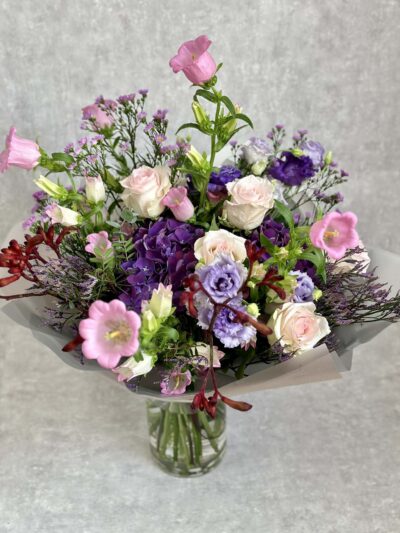 Ühuline ja külluslik suvine kimp roosades ja lillades toonides: hortensia, campanula, preeriakell ja muud hooajalised lisalilled