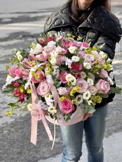 Külluslik lillekarp erinevas toonis roosade ja kreemikate rooside ja preeriakelladega. Karbi ülemise osa (lillepalli) läbimõõt u 50cm.