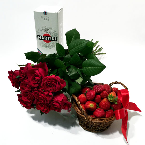 Bouquet of red Roses, Asti Martini, strawberries