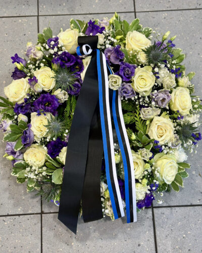 Wreath: white and violet flowers (roses, irises, crysantemums etc)