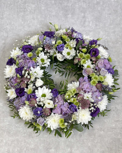 Oasise alusel lilli täis pärg (krüsanteem, nelk, kobarnelk). Läbimõõt u 45 cm