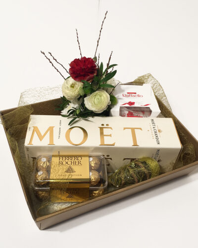 Stiilne kingitus nii kallimale kui äripartnerile. Kinkekarbis Möet shampanja, Gerrero Rocher ja Raffaello kommid ning kaunistuseks väike lilleseade.