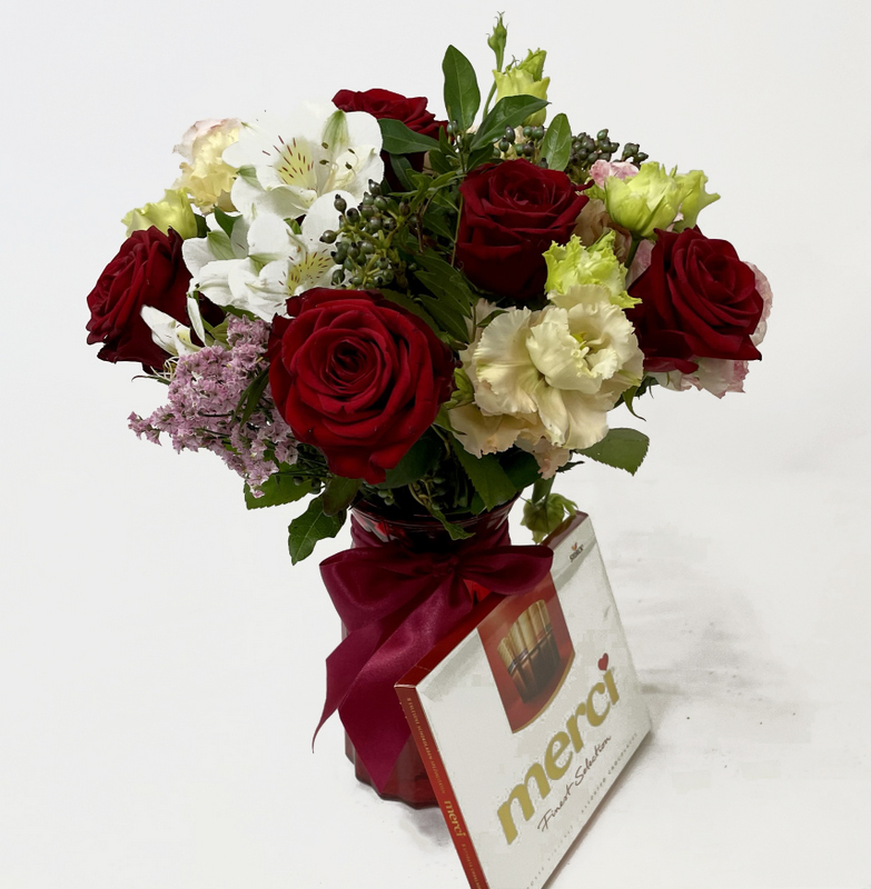 Ilus komplekt kinkimiseks: lillekimp koos punase klaasvaasi ja Merci kommikarbiga