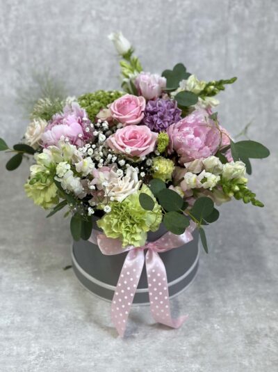 Värske ja õrn lilleseade, milles on pojenge, preeriakellasid, freesiaid, roose jms. Lilled püsivad karbis kaua ilusad