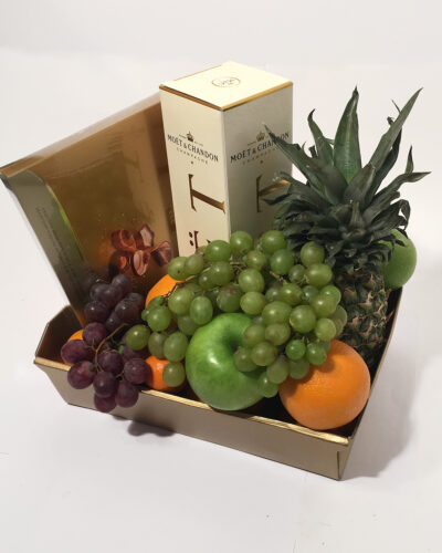 Luksuslik kinkekorv, mis sisaldab Möet shampanjat (kinkekarbis), Lindti kommide assortiid, erinevaid puuvilju (ananass, kiivi, apelsin, õunad jms vastavalt hooajale)