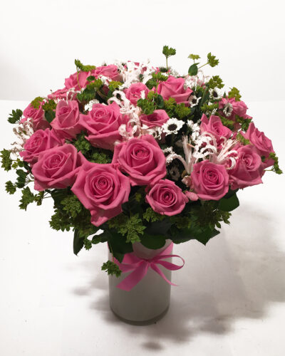 Õrn ja naiselik kimp roosade rooside ja lisalilledega (oksakrüsanteem, alstromeeria, limoonium vms)