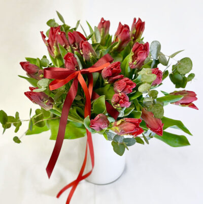 Ilus ja trendikas kimp tunastest tulpidest eukalüpti okstest
