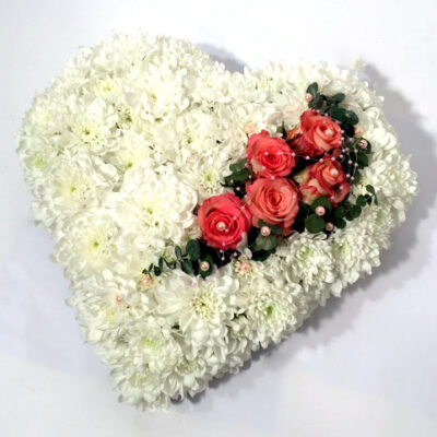 Valgetest täidisõielistest krüsanteemidest süda, millele annab aktsendi roosikaunistus. Laiema osa läbimõõt u 40-45cm