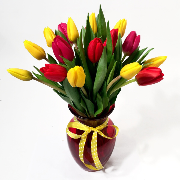 Multicoloured tulips in red glass vase