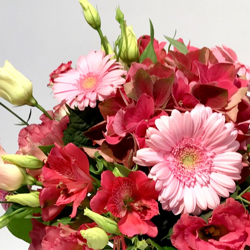 Rõõmus suvine kimp erinevatest hele- ja tumeroosadest õitest (gerbera, preeriakell, alstromeeria jm). Lillevalik sõltub antud hooajal saadaolevatest lilledest