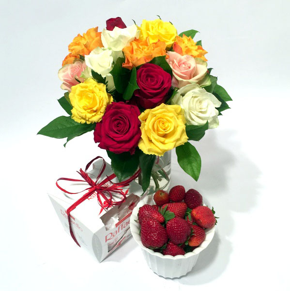 Armas komplekt, mis paneb jää sulama ja toob naeratuse näole. Kimp erivärviliste roosidega, Raffaello kommikarp  ja maasikad (u 400g).