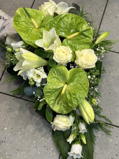 Траурный букет- белые розы, лилии и зеленыи антуриум