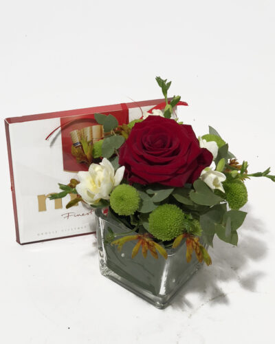 Maitsekas ja stiilne komplekt: punase roosiga lilleseade klaasvaasis ja Merci shokolaadikommide karp