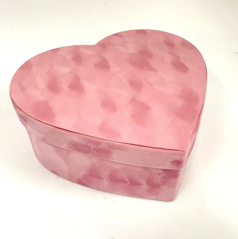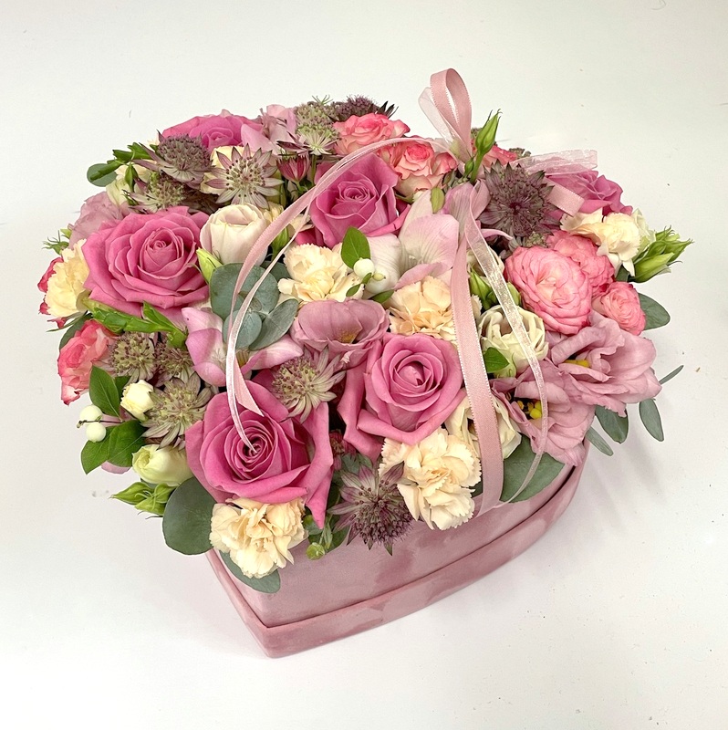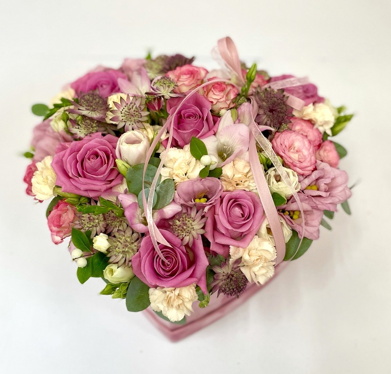 Roosadest lilleõitest koosnev süda sametises karbis.