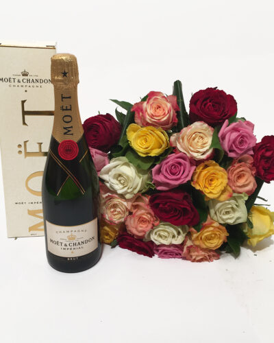 Luksuslik kingitus kõige kallimale. Tuntud kvaliteedis Möet shampanja ja lummav kimp erivärviliste roosidega.