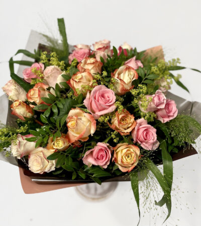 Luksuslik kimp erinevatest roosadest ja kreemikat värvi roosidest. Kimbule on mahu andmiseks lisatud vaherohelist ja ilus pakend
