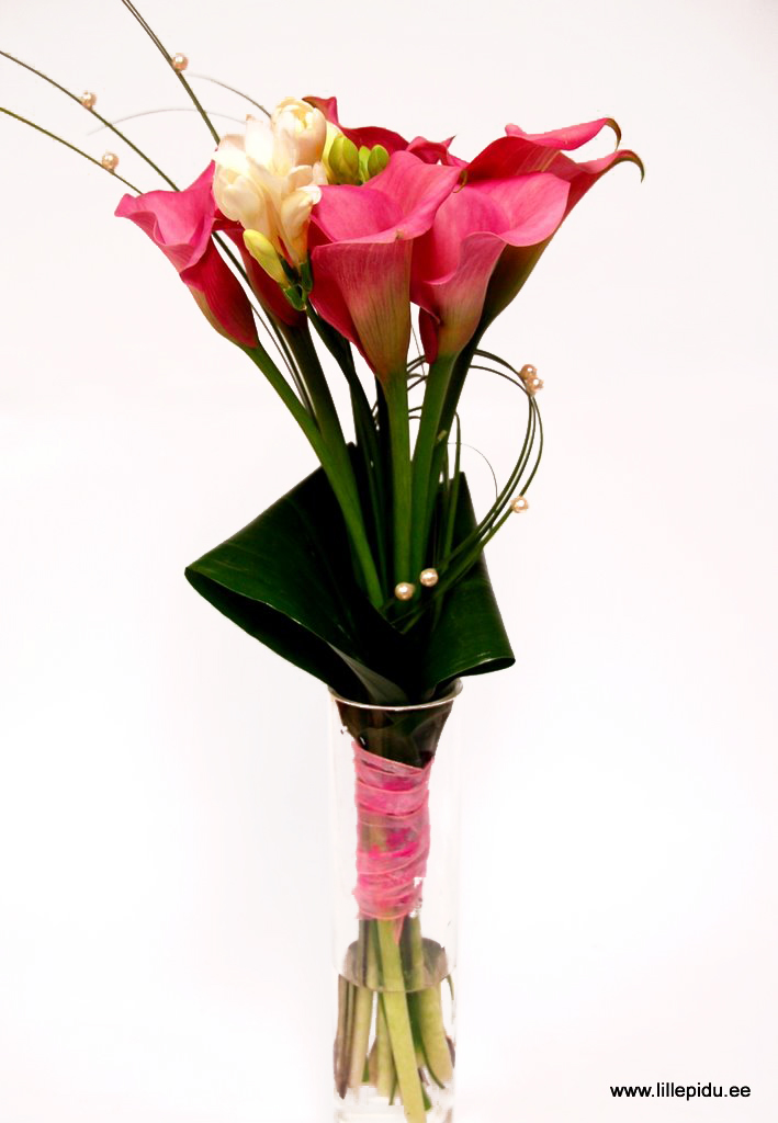 Stiilne kimp värviliste kallade (vähemalt 50cm) ja freesiatega. Lisandiks aspidistra lehed, pärlid, kaunis pael