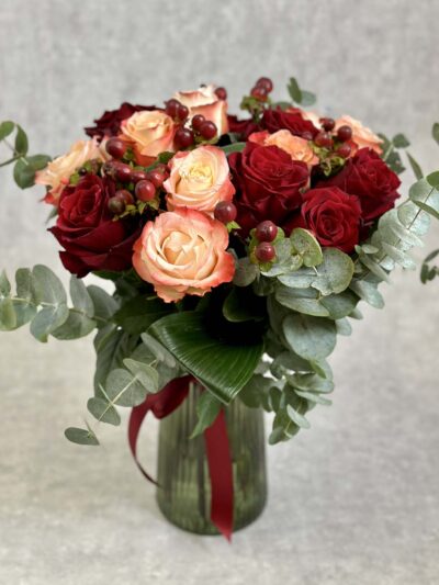 Värvikas ja soe kimp punaste ja oranzide rooside ning sobivate lisalilledega.