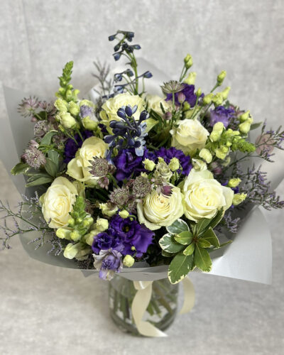 Kaunis ja rahulik värvikombinatsioon. Kimbus segunevad erinevad valged ja lillakad lilled: roosid, iirised, alstromeeriad, preeriakellad, ornitogalumid jms. Pildil olev on keskmise suurusega kimp
