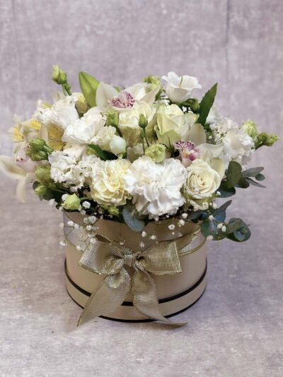 Valgetes toonides õrn ja õhuline lilleseade ümaras karbis. Lilledest on karbis roose, liiliaid, orhideesid, preeriakellasid jm. Lisandiks kuldsed delatilid