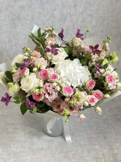 Külluslik ja lopsakas kimp, mille põhililleks on valge hortensia. Lisaks erinevaid roosakaid ja lillasid õisi: preeriakell, roos, kobarroos, campanula jms