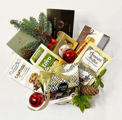 Ilus kingitus magusasõbrale. Korvis on 7 erinevat küpsiste, shokolaadide ja kommide karpi, lisaks pähkid ja kvaliteetne tee.