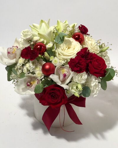 Valgetes ja punastes toonides sädelev lilleseade ümaras karbis. Lilledest on karbis roose, liiliaid, orhideesid, preeriakellasid jm. Lisandiks sädelevaid kuule jms