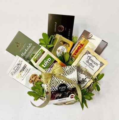 Ilus kingitus magusasõbrale. Korvis on 7 erinevat küpsiste, shokolaadide ja kommide karpi, lisaks pähkid ja kvaliteetne tee.