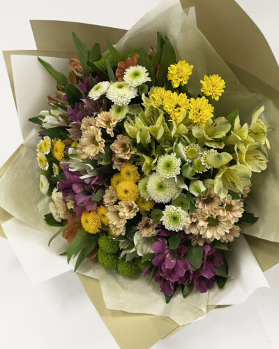 Külluslik ja kauasäiliv kimp santiini krüsanteemide ja alstromeeriatega.