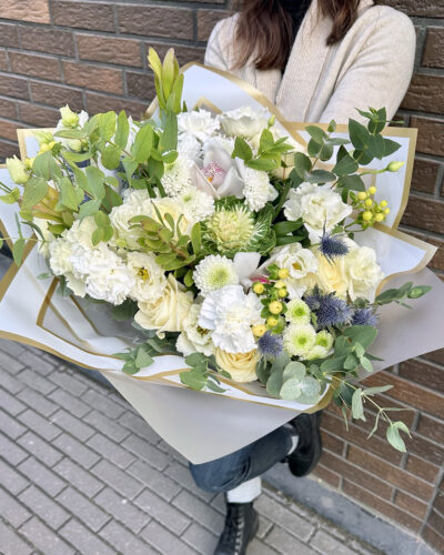 Uhke ja lopsakas lillekimp erinevatest valgetest ja kreemikatest lilledest- orhidee, roosid, preeriakellad, krüsanteemid jm