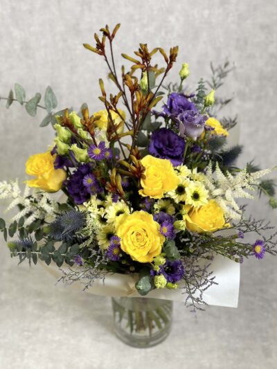 Rikkalik ja lopsakas kimp erinevatest kollastest ja lilladest lilledest: preeriakell, freesia, roos, kobarroos, lõvilõug, erinevad rohelised oksad ja kõrred