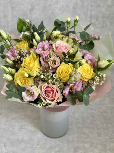 Kimbus on kollastes, kreemikates ja roosades toonides õied: roos, preeriakell, kobarnelk, alstromeeria jm