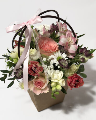 Õrnades roosades ja kreemiketas toonides lillekorv. Lillevalikus on roose, tulpe, alstromeeriaid, freesiaid jms