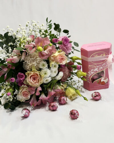 Imearmas komplekt igas vanuses printsessile. Roosades toonides lillekimp ja roosa karp Lindti shokolaadikomme