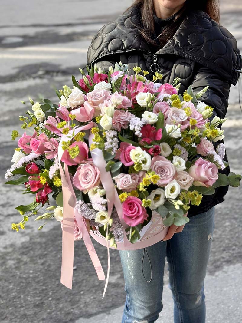 Värske ja õrn lilleseade, milles on erinevaid roosasid roose, preeriakellasid, freesiaid, nelke jm hooajalisi lisalilli. Lilled on stiilses kuldses anumas, kaunistatud kuldse paelaga.