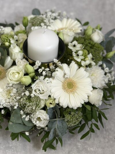 Ümar lilleseade valgete õitega. Keskel küünal klaasanumas. Sobib hästi peielauale
