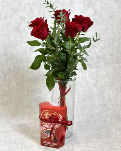 Graatsiline kimp punaste rooside ja eukalüpti okstega, lisaks punane Lindt kommikarp