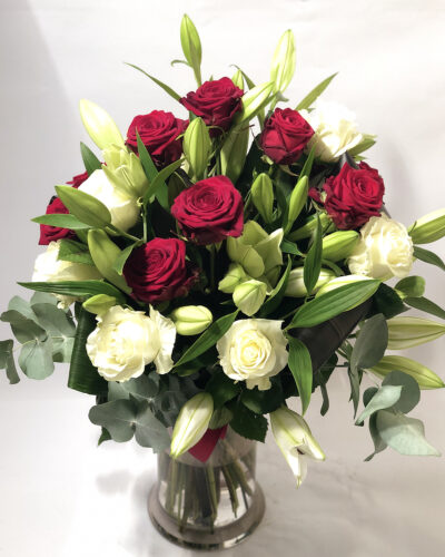 Muljetavaldav kimp valgete ja punaste rooside ja valgete liiliatega.