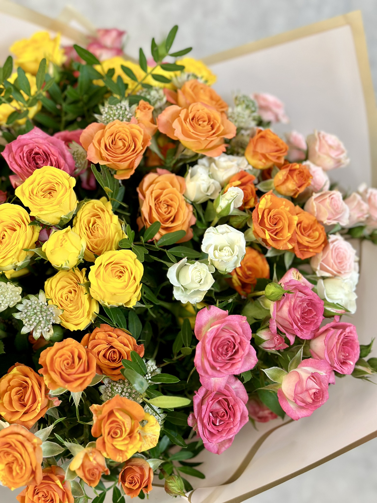 Rõõmus ja lopsakas värviplahvatus erivärvilistest kobarroosidest. Väiksemas kimbus on 11 roosi, keskmises 15 roosi ja külluslikus 19 roosi