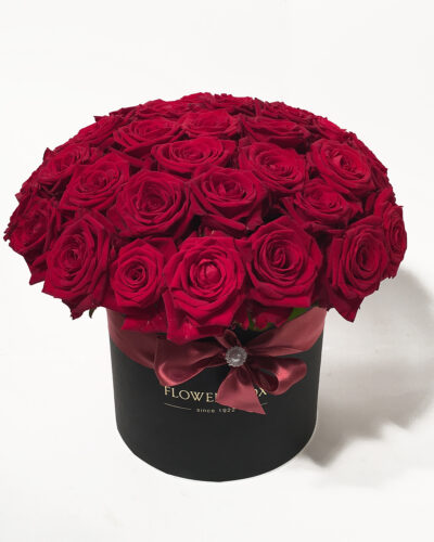Stiilne kingitus, millega ei saa eksida. Kvaliteetsesse karpi asetatud punased sametised roosid püsivad kaua värsked kuna karbis on ka märg oasise-materjal.