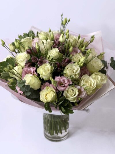 Lopsakas kimp kreemikas-valgete rooside, roosade alstromeeriate ja preeriakelladega.