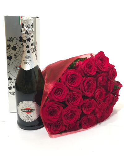 Kimp punaste roosidega ja Martini Asti kinkekarbis