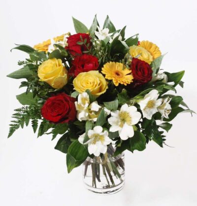 Särav ja lopsakas kimp, milles punased ja kollased roosid, heledad alstromeeriad ja minigerberad