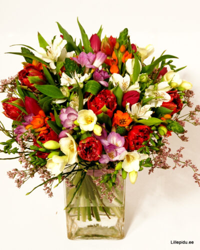Särav kevadine kimp, milles põhililledeks tulbid, freesiad ja alstromeeriad.