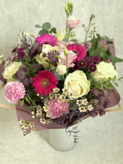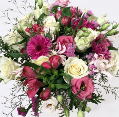 Kaunis ja õrn kimp, milles valgetele roosidele annavad tooni lillakad ja roosakad gerberad, alstromeeriad, preeriakellad ja muud lisalilled