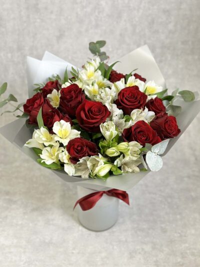 Ilus ja lopsakas kimp sügavpunaste roosidega, mille värvi toovad paremini esile valged alstromeeiad.
