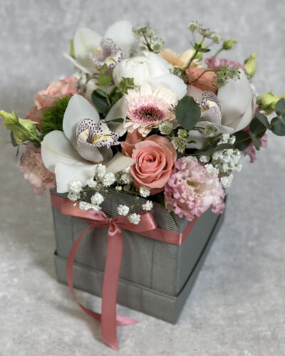 Karbis on õrnades pastelsetes toonides roose, minigerberaid, preeriakella, orhidee õisi jm. Karbi mõõdud on u 17x17cm, lilleseade u 20x20cm