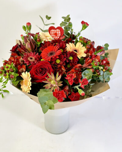 Lopsakas kimp erinevatest punastes ja kreemikates toonides lilledega (roos, gerbera, alstromeeria, krüsanteem, hypericum, kobarnelk ja teised)