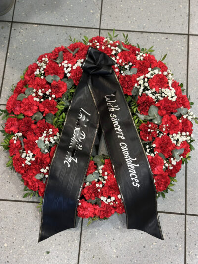Lilli täis pärg punaste nelkide ja kipslilledega