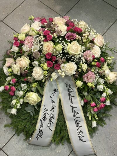 Eksklusiivne pärg südamlikuks ärasaatmiseks. Kreemidele lilledele annavad sügavust roosad ja fuksiatooni õied. Pärja läbimõõt u 65 cm